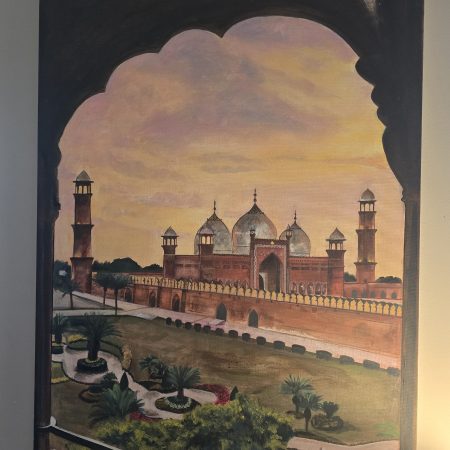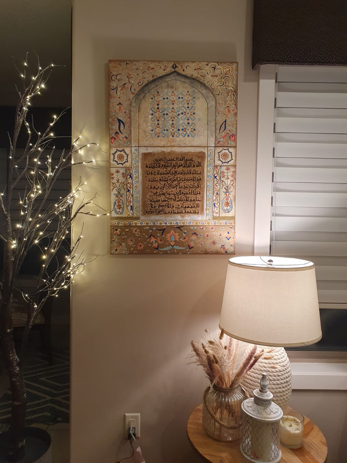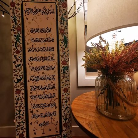 Ayat al kursi in ancient Iraqi kufic writing. Hand painted. Height: 3 ft Width: 2ft Depth: 0.5 ft Painting on canvas stretched on a wooden frame, ready to hang