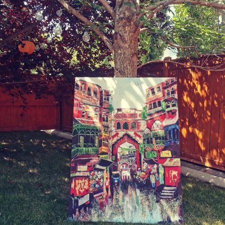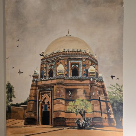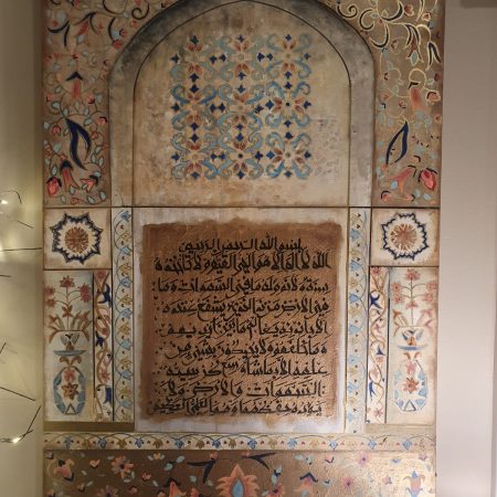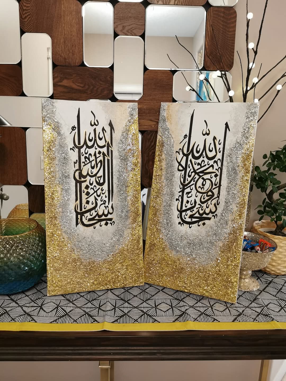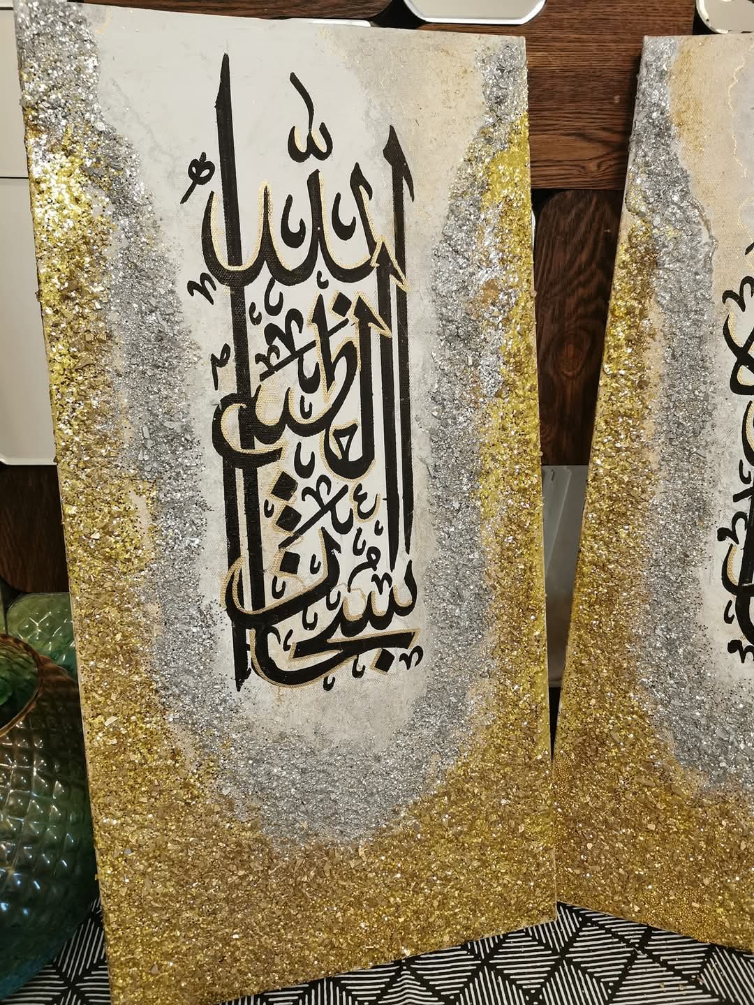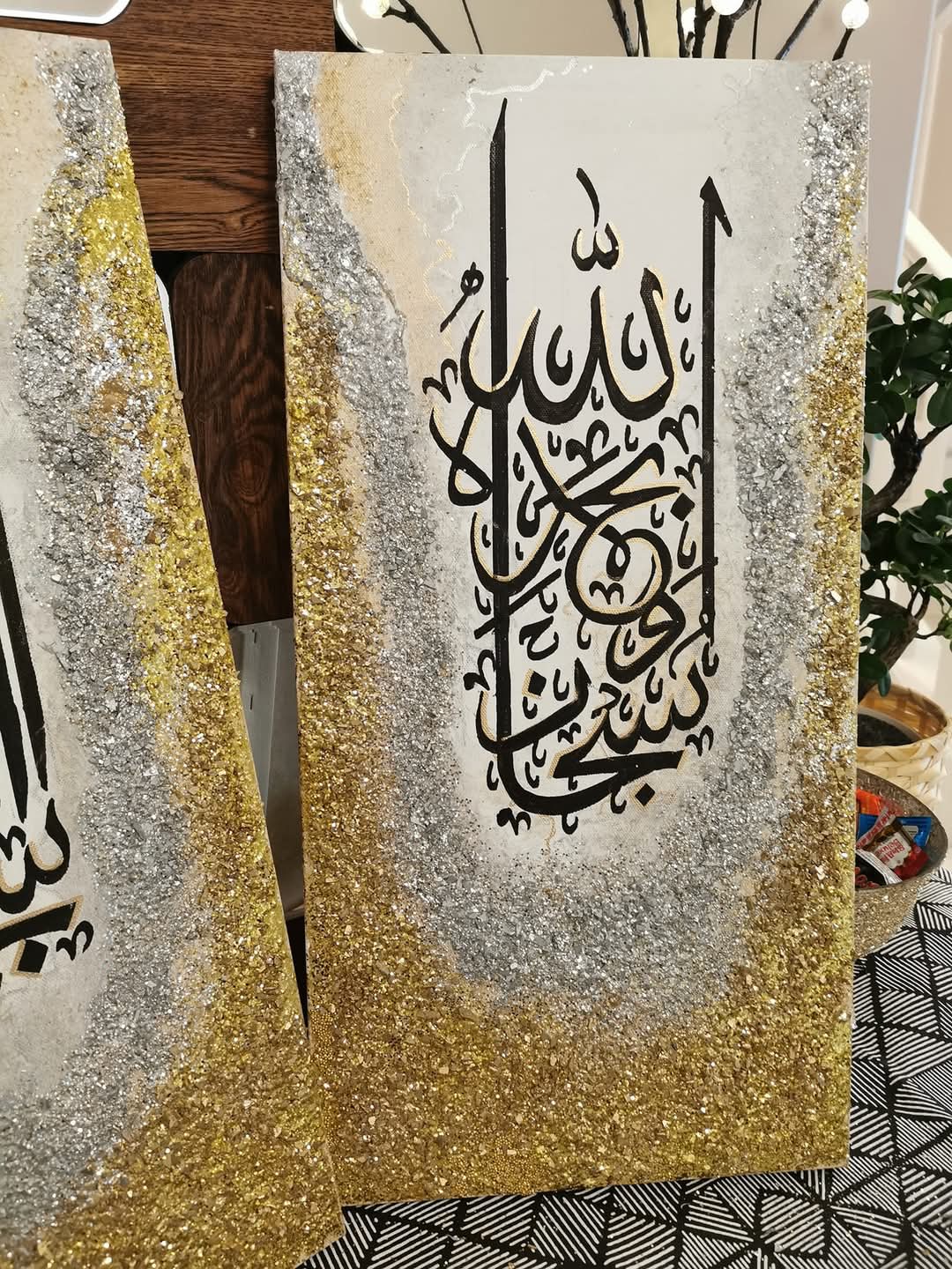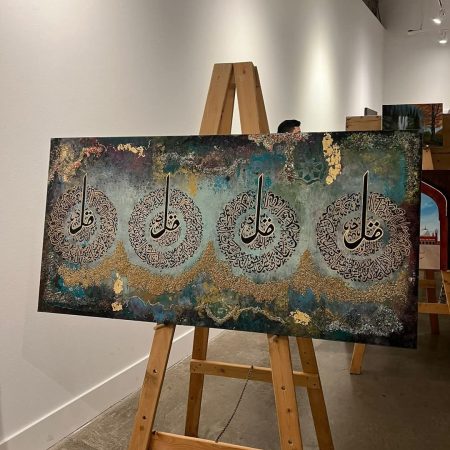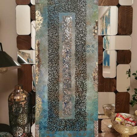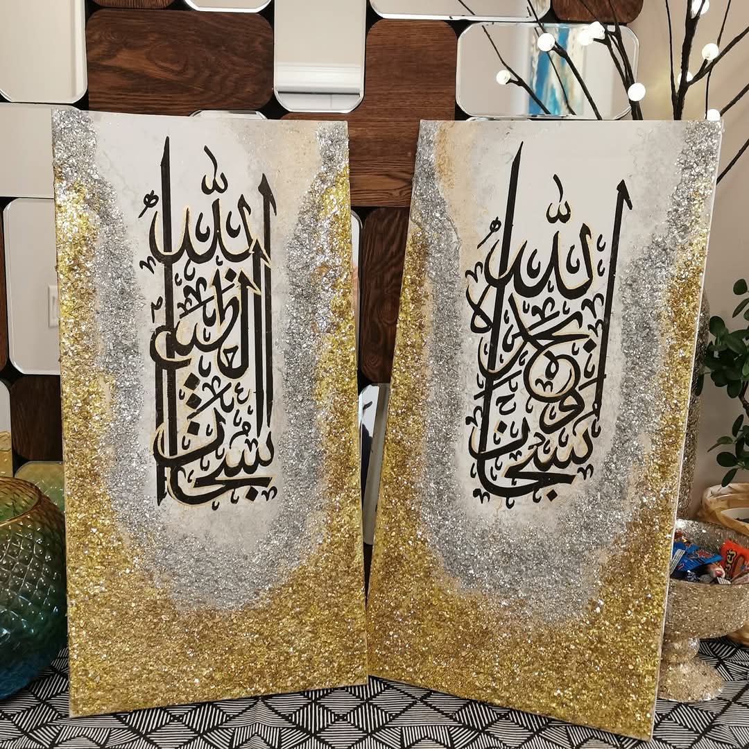 The combination of white, gold, and silver brings a sense of purity and elegance, while the powerful phrase “Subhan Allah wa Bihamdihi, Subhan Allahil Azeem” (Glory is to Allah, and praise is to Him; Glory is to Allah, the Most Great) adds a spiritual depth to the artwork. size 1 by 3 ft mixed media…